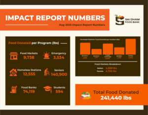 Sai Dham Food Bank has been a cornerstone in the fight against hunger within the Greater Toronto and Hamilton Area (GTHA) for over a decade. As an independent food bank, we are dedicated to serving a diverse demographic, including Seniors, people with Disability, Children, the Homeless, and Students Grocery Program across 26 cities in the GTHA. We take pride in being the only Food Bank in Canada that provides door step delivery of groceries and fresh produce to our seniors and people with mobility issues. Through our various impactful programs, Sai Dham Food Bank is continually expanding its reach, embodying a commitment to eradicate hunger and foster a community of support and abundance.